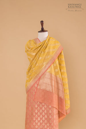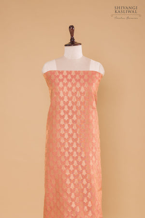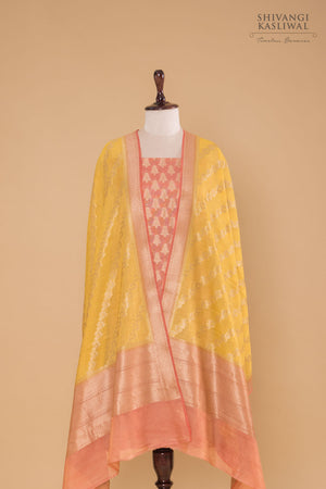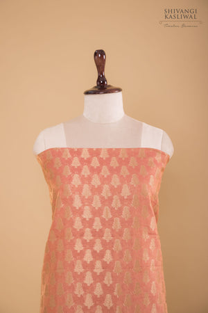Handwoven suit piece in chanderi tissue woven in buti kurta accompanied with a contrasting arraor striped dupatta.