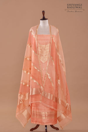 Soft peach tones define this raw silk kurta, adorned with subtle booti motifs that lend it a gentle, handcrafted richness, further elevated by an elegantly woven neck. Paired with a shaded peach organza dupatta woven in diagonal accents, the ensemble comes together with a fluid play of texture and tone, exuding understated sophistication.