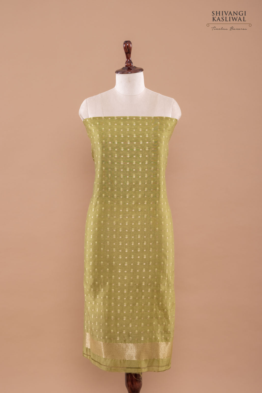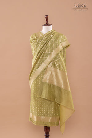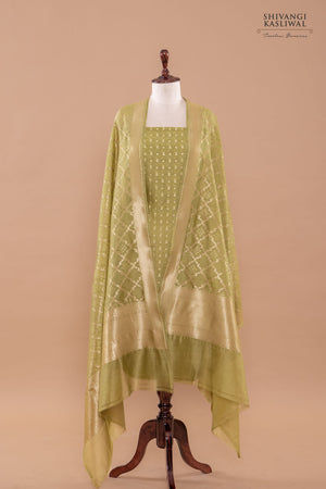 Rendered in a fresh pista green Chanderi, this suit piece highlights a kurta adorned with delicate buti motifs. The look is completed with a beautifully balanced dupatta woven in a structured chaukdi jaal, creating an ensemble of subtle elegance and refined charm.