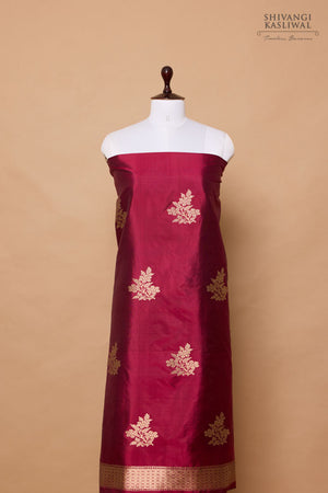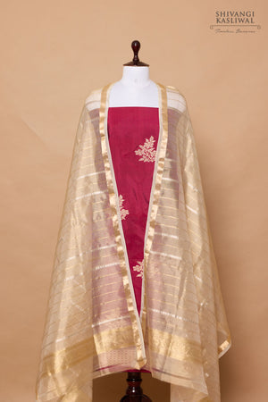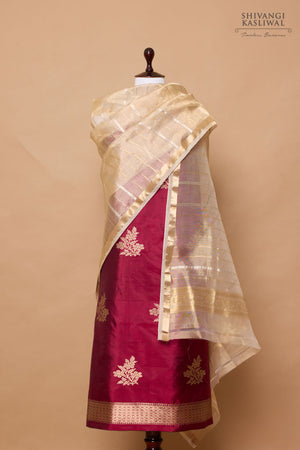 Handwoven suit piece in katan silk with woven floral butas in the kurta accompanied with a contrasting Ivory stripe dupatta.