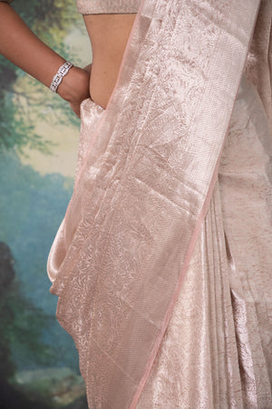 Clad in a soft baby pink, this Banarasi tissue silk saree radiates an opulence that is both lyrical and commanding. The sheer silk surface gleams with refined brilliance, adorned with an intricate floral jaal where graceful parrot motifs are seamlessly woven into the design. Rendered in glowing silver zari, the composition unfolds with depth and richness, evoking a sense of regal artistry and timeless allure.