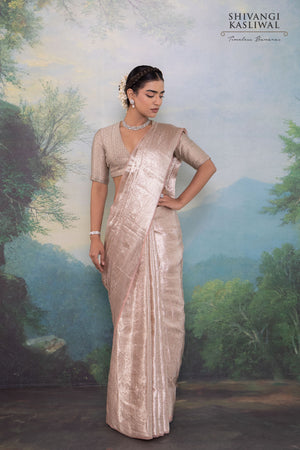 The translucent finesse of tissue silk enhances the soft metallic shimmer, allowing the drape to glow with an indulgent, almost ethereal radiance. Rich in symbolism and exquisite in execution, this saree is a testament to Banarasi mastery—where heritage, detail, and luxury unite in enduring elegance.