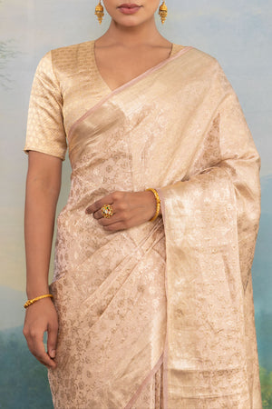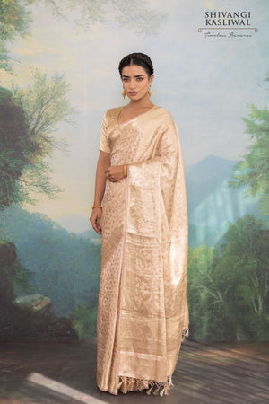 Clad in a refined shade of beige, this Banarasi tissue silk saree embodies a quiet, aristocratic luxury. The luminous silk forms a soft, glowing canvas, while a distinctive chevron border unfolds with an intricate floral jaal, meticulously handwoven in radiant gold zari. The rhythmic chevron structure frames the drape with elegance, while the floral detailing lends depth and a sense of cultivated richness.