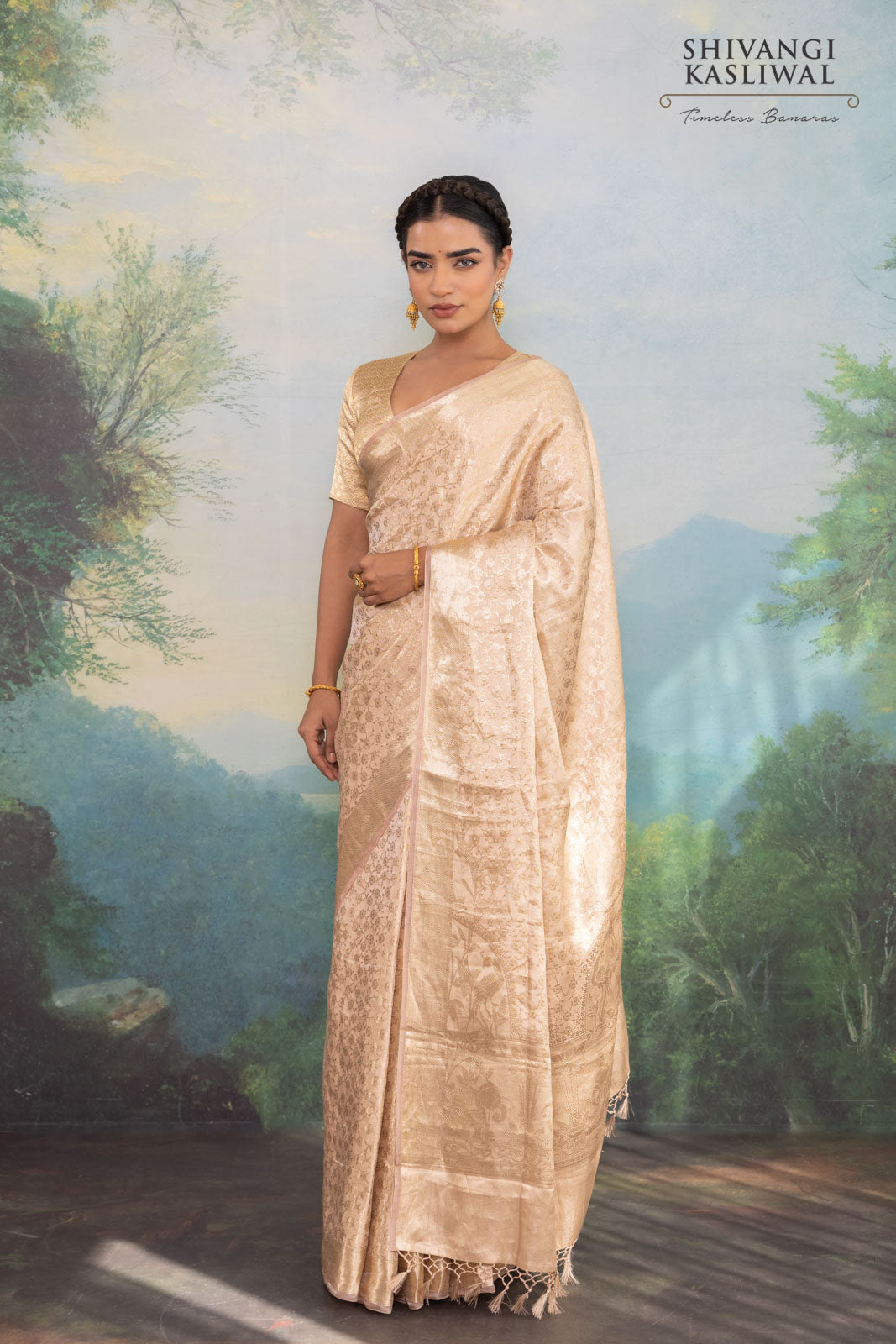 The natural translucence of tissue silk enhances the warm gleam of the zari, allowing the saree to shimmer with restrained opulence at every movement. Composed, graceful, and enduring, this creation reflects the finesse of Banarasi craftsmanship—where heritage is expressed through precision, balance, and refined splendor.