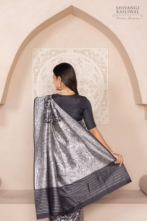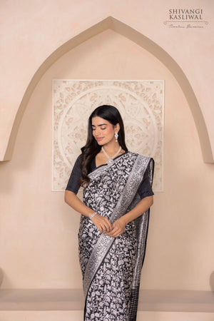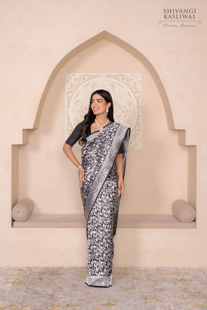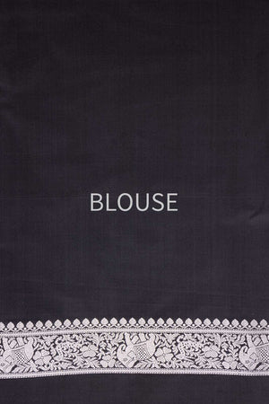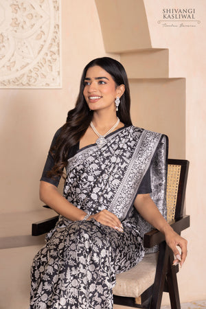 A tapestry of untamed grace, this black katan silk saree is a vision steeped in regal splendor. The opulent silver zari shimmers across the body, forming an intricate Shikargah jaal that evokes the mystique of royal hunts and ancient forests. Each motif—meticulously handwoven—echoes the finesse of Banarasi craftsmanship passed down through generations.