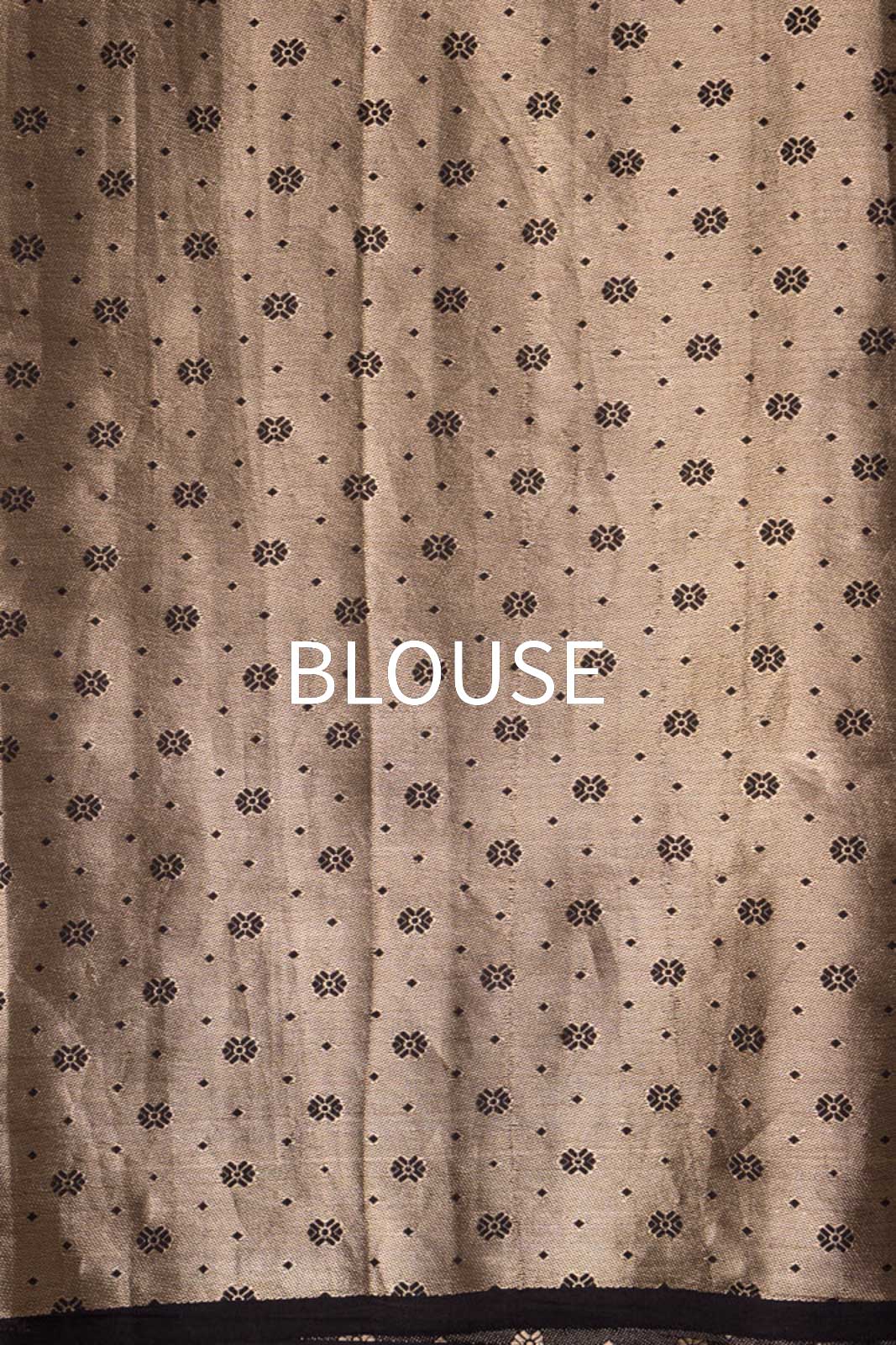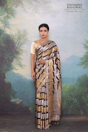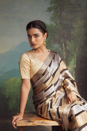 Each geometric form is woven with exacting precision, allowing light to travel across the surface in controlled flashes of brilliance against the inky depth of the silk. The result is a composition that balances power with refinement, modern structure with timeless Banarasi mastery. Crafted for the connoisseur who commands presence through restraint and depth, this saree stands as an embodiment of elevated luxury and enduring sophistication.