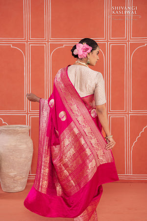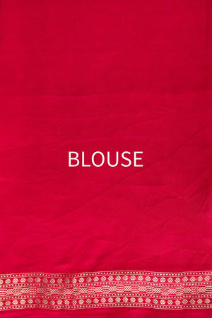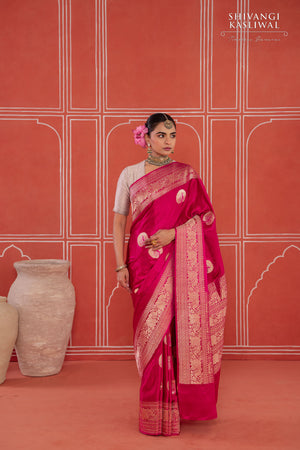 In a luxuriant shade of cherry red, this Banarasi gajji silk saree unfurls with a depth and brilliance that feels unmistakably regal. The splendour of the kadhua weave reveals itself through every intricately anchored thread, allowing the gold zari to glow with a burnished, opulent radiance. Across this rich expanse, peacock bootas enhanced with soft pink mina shimmer like jeweled emblems, while a majestic shikargah tableau weaves through the silk—echoing the grandeur of age-old artistry and storytelling.