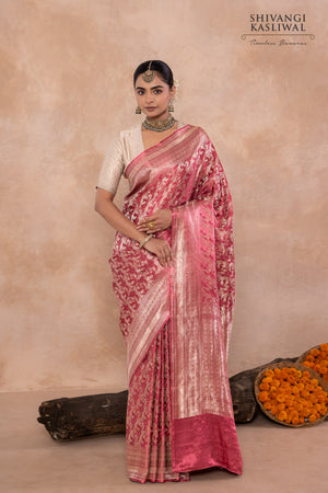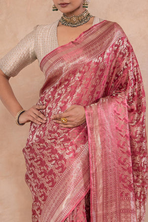 Radiating the subtle elegance of dusty pink, this Banarasi gajji silk saree embodies timeless grandeur. The antique zari glimmers softly across the fabric, intricately brought to life through the refined tanchoi weave. Graceful birds take form amidst a sophisticated shikargah pattern in a arra jaal, weaving a narrative of artistry, movement, and heritage across the silk.