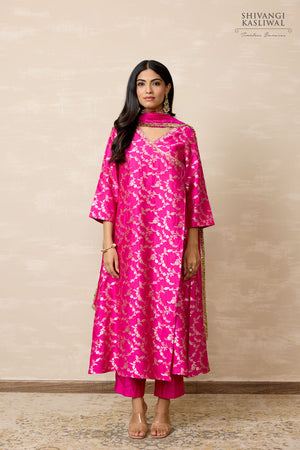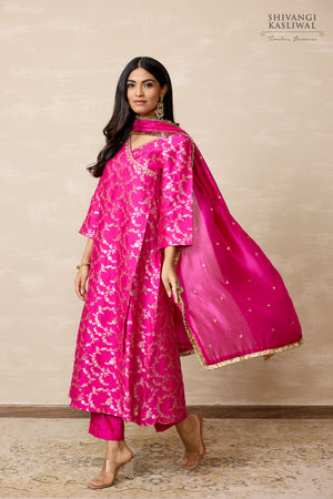 • Embrace the height of sophistication with our Fuchsia Pink Chiniya Silk Angarkha Suit Set, a luxurious fusion of tradition and contemporary flair. Crafted from the finest handwoven chiniya silk, this suit set showcases a stunning floral jaal pattern that adds unparalleled depth and allure to the fabric. Lavishly embellished with exquisite aari, zardozi, and sequin hand embroidery, it radiates an aura of timeless elegance and refined splendor. Complemented by matching chiniya silk pants and a soft, ethereal organza dupatta adorned with delicate gota fringes, this ensemble stands as a testament to impeccable craftsmanship and regal luxury. Designed for those who seek to leave a lasting impression, it epitomizes exquisite grace and sophistication.