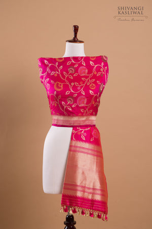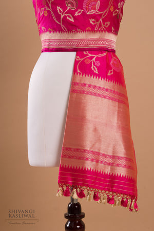 This radiant fuchsia pink Banarasi dupatta is a breathtaking blend of opulence and artistry. The intricate cutwork and delicate jaal pattern are brought to life with vibrant minakari accents, creating a striking contrast against the bold pink hue. Crafted from luxurious silk, it drapes with regal fluidity, exuding timeless sophistication and unparalleled grace.