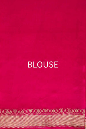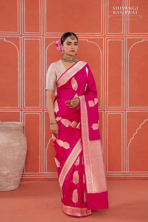 Bathed in the sumptuous glow of fuchsia pink, this Katan silk Banarasi saree exudes unparalleled grandeur. An intricate paisley buta, woven in shimmering gold and silver zari through the exquisite kadhua weave, cascades across the silk with majestic precision, each motif a testament to the timeless mastery of Banaras craftsmanship. The interplay of metallic brilliance against the vibrant silk transforms the drape into a radiant symphony of luxury, where every fold glimmers with regal intensity.