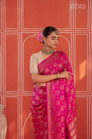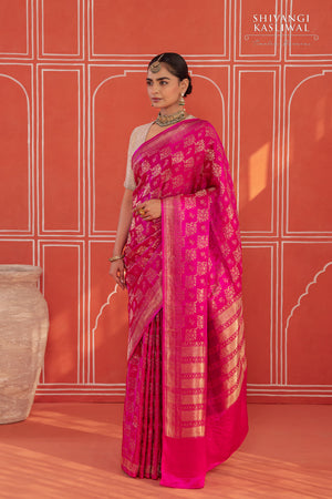 In a resplendent shade of fuchsia pink, this Banarasi gajji silk saree resonates with an opulent, luminous allure. The sumptuous tanchoi weave forms a richly textured surface, allowing the silk to glimmer with layered depth while showcasing the mastery of its craftsmanship. Spanning the drape is an intricate floral jaal interlaced with graceful birds, set parallel to stately elephant and horse motifs, each form woven with stately precision—unfolding a grand shikargah narrative that evokes royal processions, timeless artistry, and the magnificence of Banaras heritage.