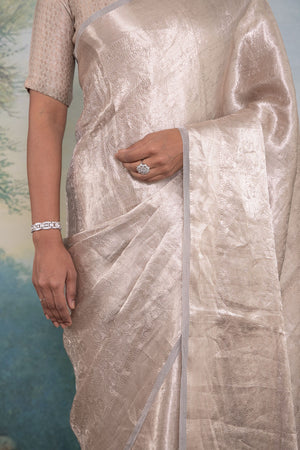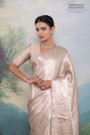 The natural sheen of tissue silk enhances the subtle metallic accents, allowing the saree to glow with a composed, indulgent radiance. Rich in detail and refined in expression, this creation reflects the essence of elevated Banarasi craftsmanship—where softness and structure coexist in timeless sophistication.