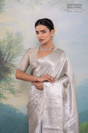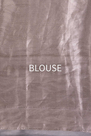 Cast in an elegant shade of grey, this Banarasi tissue silk saree exudes a dignified, aristocratic opulence. The luminous silk surface is adorned with an intricate floral jaal, where finely detailed blooms are interspersed with poised parrot motifs, all rendered in glowing water gold zari. The avian elements introduce a sense of rhythm and life, enriching the composition with depth and narrative richness.