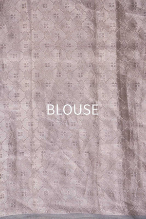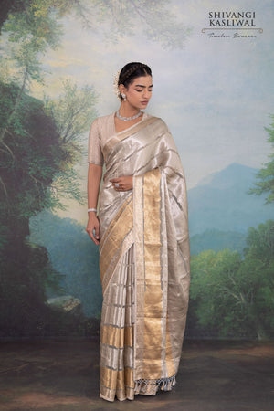 Cast in an elegant shade of grey, this Banarasi tissue silk saree embodies a poised, aristocratic sophistication. Its translucent, luminous surface is structured with finely woven horizontal bands, rendered in a refined dialogue of silver and gold zari. Towards the border, a pair of radiant gold stripes emerges with quiet authority, setting itself apart from the surrounding silver lines and lending the drape a composed yet commanding finish.