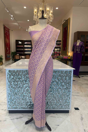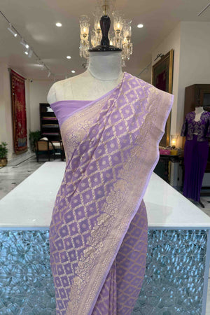 Enveloped in a serene lavender hue, this Banarasi georgette saree radiates understated grandeur. The refined chaukdi jaal, adorned with delicate butis woven in glowing gold zari, creates a mesmerizing play of texture and light. Graceful in drape and timeless in appeal, it’s a true testament to Banaras’ enduring artistry.