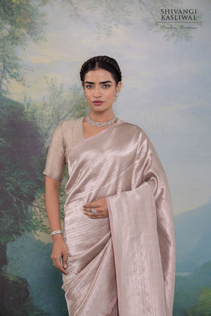 Executed in luminous silver zari, the detailing shimmers with a liquid, jewel-like brilliance, enriching the delicate pink base with depth and opulence. Every line reflects the precision and discipline of Banarasi artistry, where heritage is translated into refined luxury. Sophisticated, indulgent, and enduring, this saree is crafted for the connoisseur who values richness expressed through balance, craftsmanship, and timeless elegance.