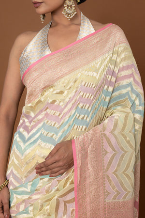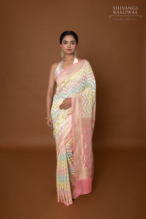 Alive with movement and color, this multicolor Banarasi georgette saree is a vivid expression of artisanal brilliance. The bold zig-zag pattern, intricately woven in gleaming gold zari, dances across the diaphanous drape, casting a radiant glow with every step. The fluidity of georgette enhances the vibrant palette, creating a saree that feels both spirited and sophisticated. A dazzling blend of tradition and modern flair, it’s crafted for the discerning eye that seeks drama wrapped in elegance.