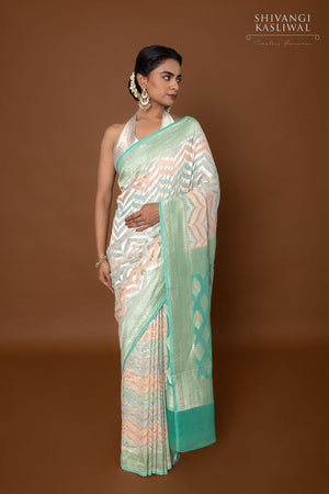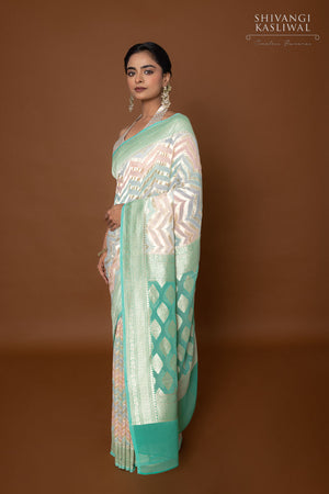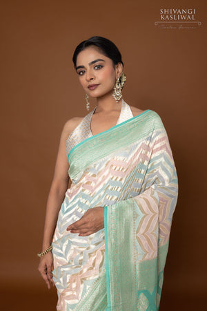 Awash in a medley of vibrant hues, this pastel multicolor Banarasi georgette saree captivates with its rhythmic zig-zag weave in opulent gold zari. The fluid drape shimmers with every movement, as the interplay of colors and metallic threads creates a tapestry of bold elegance. Light in weight yet rich in detail, it embodies the perfect fusion of tradition and modernity crafted for those who appreciate artistry with a spirited edge.