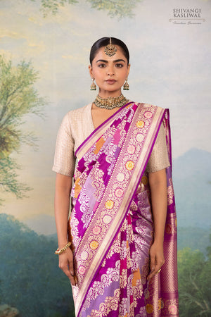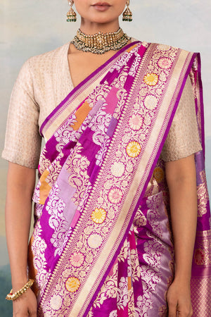 Indulge in the splendor of our multicolor rangkat silk saree—a tapestry of heritage woven with the grandeur of Banaras. Crafted using the age-old kadhua weave, this masterpiece showcases a mesmerizing diagonal floral jaal, where delicate vines and blossoms are intricately handwoven in opulent gold and silver zari, casting a soft, regal glow with every fold.