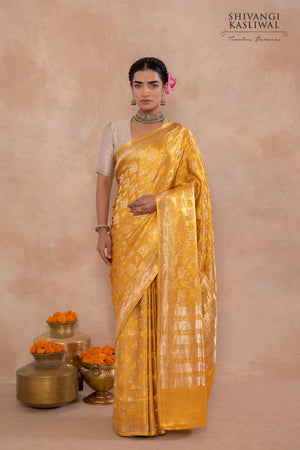 Drenched in a radiant mustard yellow, this Banarasi gajji silk saree emanates an air of ceremonial grandeur and luminous richness. The intricate tanchoi weave lends the silk a densely textured surface, allowing light to glide across its folds while revealing the depth and precision of masterful craftsmanship. Spanning the drape is an elaborate floral jaal, animated by elegant birds and aligned with majestic elephant and horse motifs—each figure meticulously rendered to compose a commanding shikargah narrative rooted in royal heritage and timeless artistry.