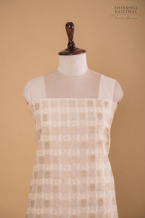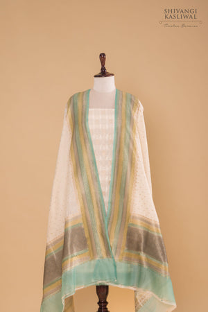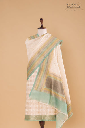 Handwoven suit piece in chanderi woven in chaukdi jaal buta kurta accompanied with a buti dupatta.