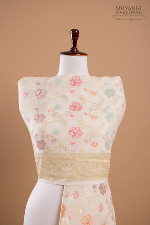 An exquisite off-white Banarasi moonga silk dupatta, adorned with a mesmerizing multi-mina jaal pattern, artfully woven with shimmering gold and silver zari threads. The intricate minakari enhances its opulent charm, creating a stunning interplay of colors and textures that speaks to the timeless elegance of traditional craftsmanship.
