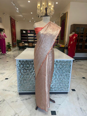 Glowing in a vibrant hue of orange, this Banarasi tissue silk saree is a vision of radiant artistry. Woven with an exquisite chaukdi buta jaal in fluid water gold zari, it mesmerizes with its luminous sheen and intricate geometry. A celebration of traditional grandeur, reimagined with contemporary grace.