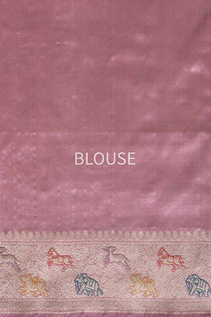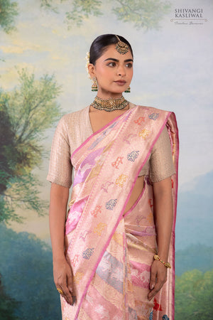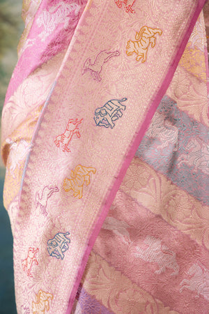 Enter a realm of rare grandeur with our pastel multicolor rangkat silk saree—an opulent testament to the timeless artistry of Banaras. Woven by master weavers in the painstakingly detailed kadhua technique, this masterpiece unveils an extraordinary diagonal jaal that tells the story of a regal shikargah. Intricately woven flora and fauna come alive alongside hunting scenes, where shikaris and wild beasts are immortalized in shimmering threads of pure gold and silver zari.