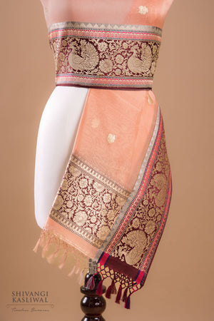 A luminous peach Banarasi silk dupatta, lavishly woven with an intricate allover buti pattern, rendered in the celebrated kadhua technique. The delicate peacock motifs, intricately crafted with gleaming gold zari, impart an air of regal elegance. Framed by a contrasting satin border, this opulent creation embodies the timeless beauty and refined craftsmanship of Banarasi silk, radiating grace and luxury with every thread.