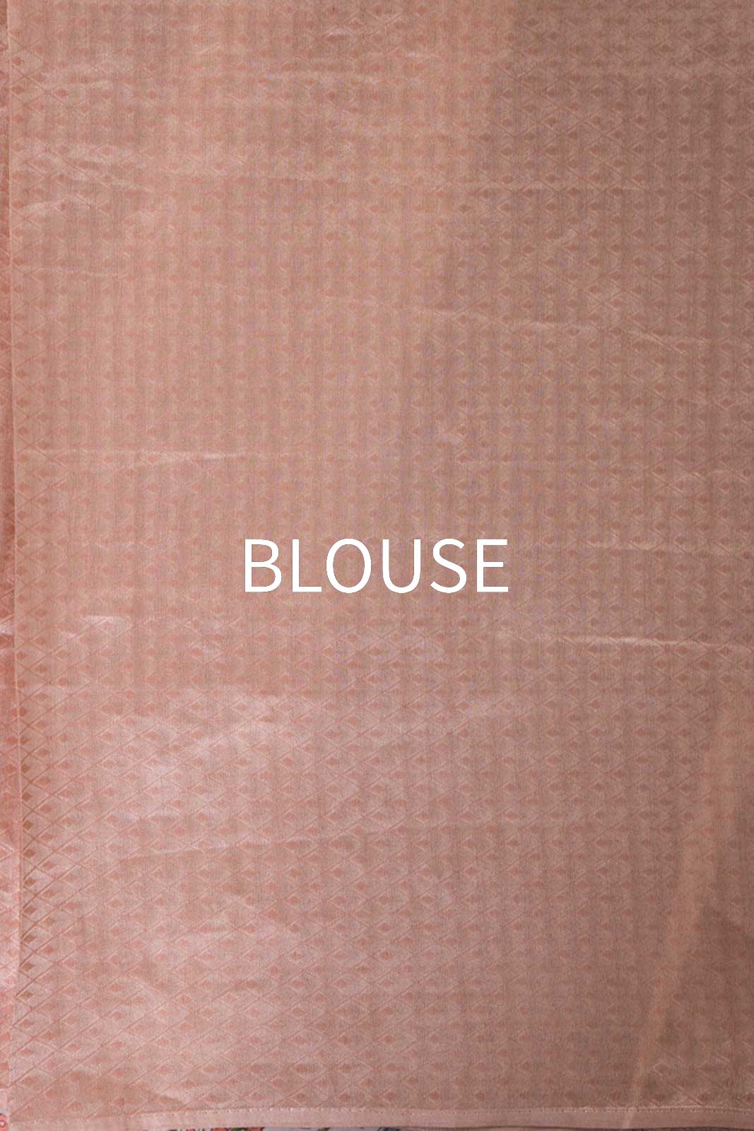 Bathed in a refined peach hue, this Banarasi tissue silk saree emanates a luminous, aristocratic elegance. Its sheer, glowing surface is adorned with an intricate chevron formation, patiently composed from a multitude of finely woven butis. Clustered together, these delicate motifs create flowing chevron bands, brought to life through an opulent interplay of gold and silver zari that adds depth and visual richness to the drape.