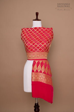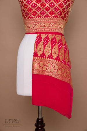 Radiating feminine grace and timeless allure, this pink Banarasi georgette dupatta is a vision in delicate craftsmanship. Adorned with shimmering zari work and touched with intricate Bandhani accents, it strikes a beautiful balance between tradition and elegance. The soft drape glides effortlessly, while the luminous pink hue adds a touch of romantic opulence. A versatile heirloom, it brings warmth, charm, and a whisper of celebration to every ensemble.
