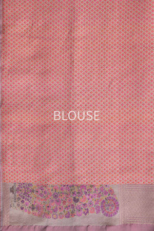 Enter a world of timeless charm with our pink katan silk saree—an exquisite manifestation of Banarasi finesse, woven in the delicate artistry of tanchoi. The body features an elegant geometric weave, a rhythmic pattern that lends the drape an understated yet commanding grace.