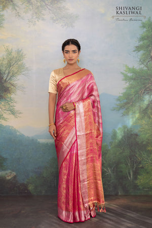 Drenched in a sumptuous pink hue, this saree exudes an aura of rarefied grandeur. The silk surface shimmers with a silken luminosity, unfolding as an opulent stage for an exquisite dialogue of gold and silver zari. Sculpted into a commanding geometric cadence, the weave reveals depth, precision, and a stately rhythm that elevates the drape into a vision of modern regality infused with timeless soul.