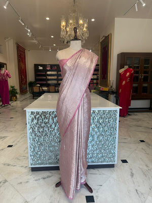 In a delicate shade of pink, this Banarasi tissue silk saree gleams with ethereal elegance. The finely woven geometric motifs in subtle water gold zari create a luminous interplay of texture and sheen. Sophisticated yet radiant, it’s a drape that epitomizes refined luxury and timeless allure.