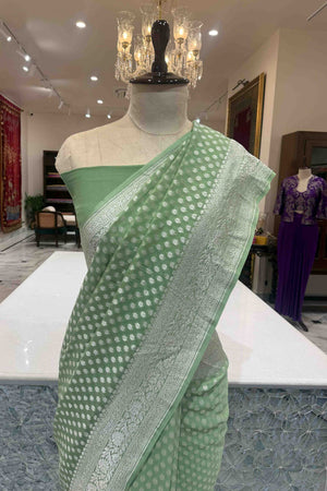 In a delicate hue of pista green, this Banarasi georgette saree exudes effortless elegance. Adorned with dainty floral bootis woven in glimmering silver zari, it reflects a soft, luminous charm. Light, graceful, and refined — it’s a serene expression of Banarasi craftsmanship and timeless beauty.