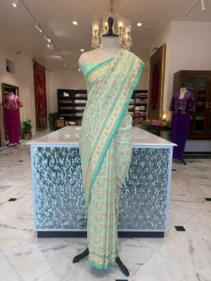 In a soothing shade of pista green, this Banarasi georgette saree whispers elegance with every fold. The intricate floral jaal, woven in glistening gold zari and adorned with delicate meenakari hues, creates a tapestry of refined beauty. Light, fluid, and resplendent — it’s a masterpiece that celebrates grace in its most exquisite form.