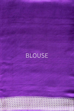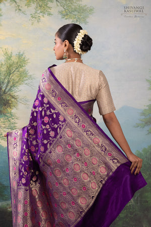 From the looms of Banaras emerges a creation of luminous grandeur—an exquisite purple gajji silk saree that radiates timeless charm. Woven in the celebrated kadhua technique, its expanse is adorned with an enchanting floral jaal, where delicate blossoms unfold in shimmering gold zari and are touched with the gentle brilliance of pink mina. The artistry lends a painterly finesse, transforming the drape into a living garden etched upon silk.