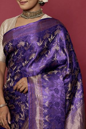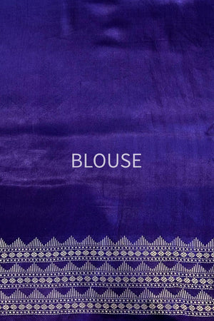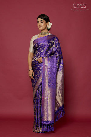 Indulge in the opulence of this luxurious purple Banarasi gajji silk saree. Exquisitely woven, it gleams with the understated charm of dull gold zari and the intricate beauty of a tanchoi weave. The sumptuous fabric glides with ease, enveloping you in a regal drape that radiates timeless grace, refined elegance, and a touch of vintage grandeur.