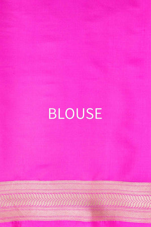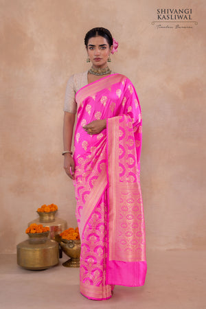 Rising upward, the saree continues its lavish dialogue through a striking all over boota arrangement, where pairs of peacocks reappear as elevated motifs, creating a seamless flow of grandeur across the silk. The vivid rani pink ground heightens the richness of the weave, allowing every form to glow with imperial intensity. Opulent, immersive, and masterfully articulated, this saree is a tribute to Banarasi excellence—crafted for the woman whose elegance is sovereign, whose taste is indulgent yet refined, and whose presence is defined by timeless, heirloom splendor.