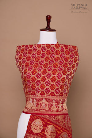 Bathed in majestic red, this opulent Bandhani dupatta is a living tapestry of tradition, emotion, and celebration. Each delicate tie-dye dot whispers of centuries-old craftsmanship, while the border unfurls like a resplendent baraat in fine zari—complete with a serene bride poised in her doli, carried with grace and reverence. The scene shimmers with life, capturing the sacred beauty of a bride’s journey, steeped in music, joy, and ritual. Radiant and regal, the dupatta drapes like a benediction—an heirloom woven with devotion, power, and poetic nostalgia. For the woman who doesn’t merely attend the celebration—she is the celebration.