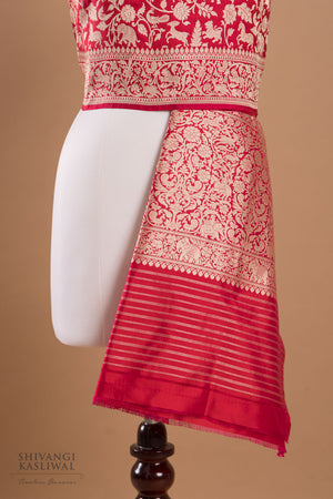 This exquisite red Banarasi dupatta, woven in opulent brocade, boasts intricate shikargah motifs and a sumptuous floral jaal. Crafted from the finest katan silk, it exudes an unparalleled sheen and graceful drape. A truly regal masterpiece, it merges timeless artistry with luxurious elegance, elevating any ensemble to pure grandeur.