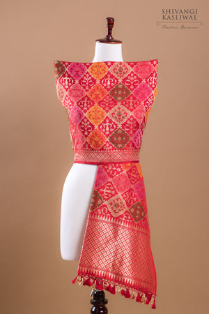 This stunning red Banarasi dupatta is a masterpiece of elegance, featuring a captivating jaal design. The rich gold zari threads and vibrant minakari accents infuse the fabric with a radiant glow, enhancing its regal allure. Crafted from the finest silk, it drapes with a luxurious fluidity, exuding timeless beauty and sophistication at every turn.