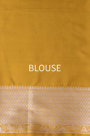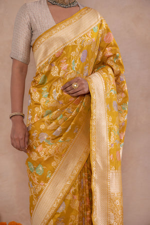 Anchoring this vivid composition, a bold chevron border introduces sculptural definition and rhythmic precision, lending architectural strength to the fluid floral narrative. The intensity of the ochre silk amplifies the vibrancy of the mina, allowing every detail to gleam with stately allure. Immersive, indulgent, and unmistakably regal, this saree is a masterful expression of Banarasi artistry—crafted for the woman whose elegance is sovereign, whose presence is luminous, and whose style is steeped in timeless, heirloom opulence.