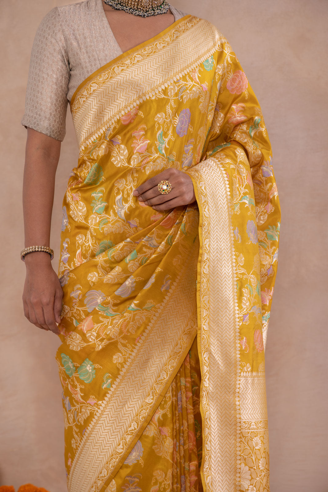 Bathed in the glowing depth of yellow ochre, this Banarasi Katan silk saree radiates a commanding warmth and ceremonial magnificence. Across its lustrous expanse unfolds an opulent floral jaal, lavishly articulated in a symphony of multi mina hues—each blossom rendered with meticulous finesse, creating a surface alive with richness, movement, and layered brilliance.
